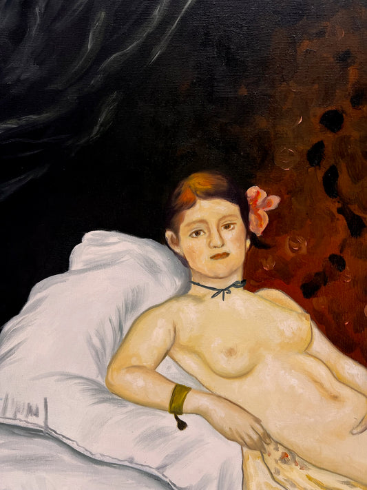 Olympia – Pintura al óleo realista pintada a mano sobre lienzo (64 × 80 cm)