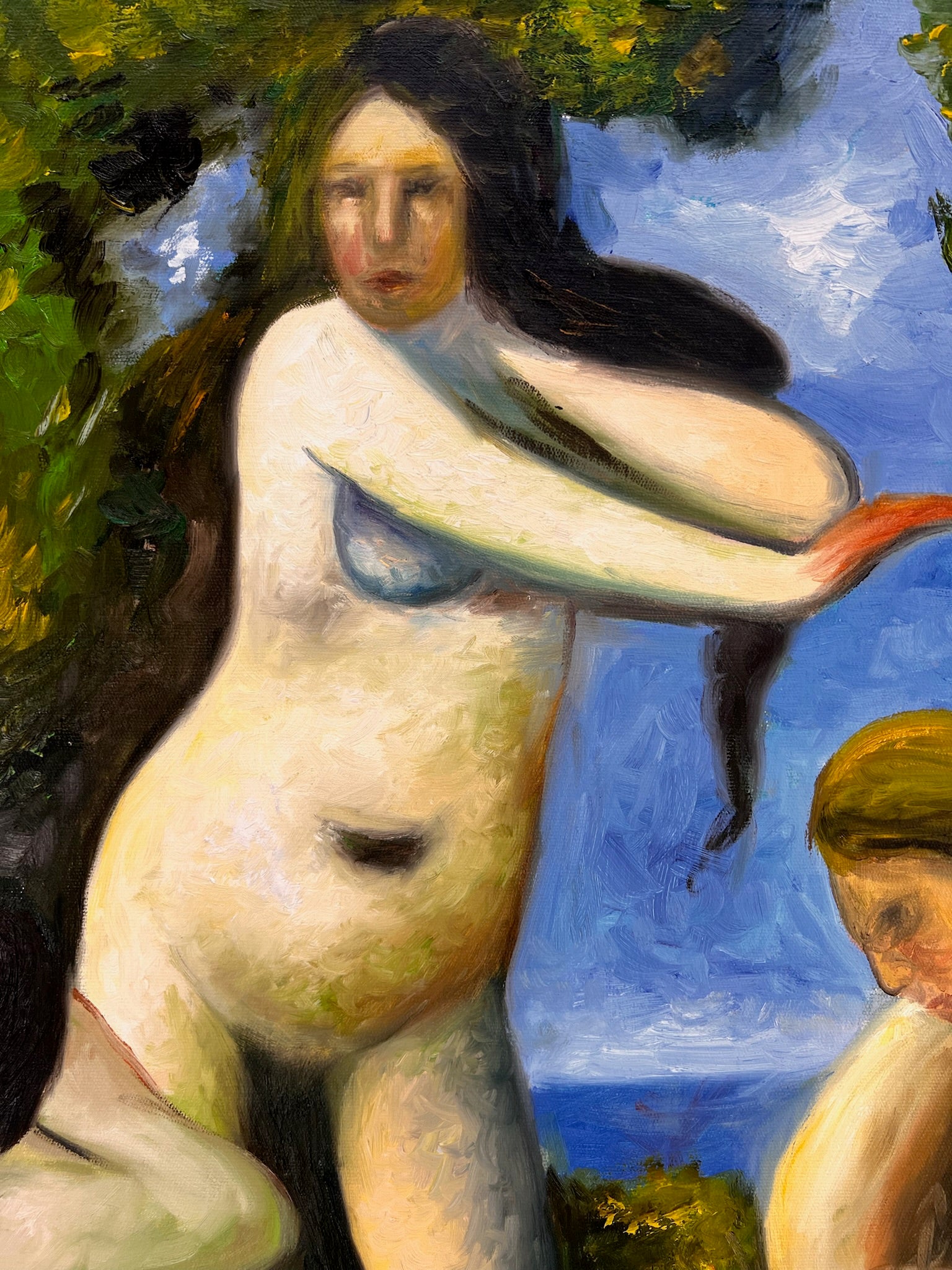 Esta hermosa tela pintada a mano está inspirada en la famosa serie de Cézanne Baigneuses, que representa grupos de mujeres bañándose en un entorno natural. La pintura muestra tres desnudos, representados con pinceladas poderosas y tonos terrosos que contrastan con el cielo azul brillante y la vegetación verde.