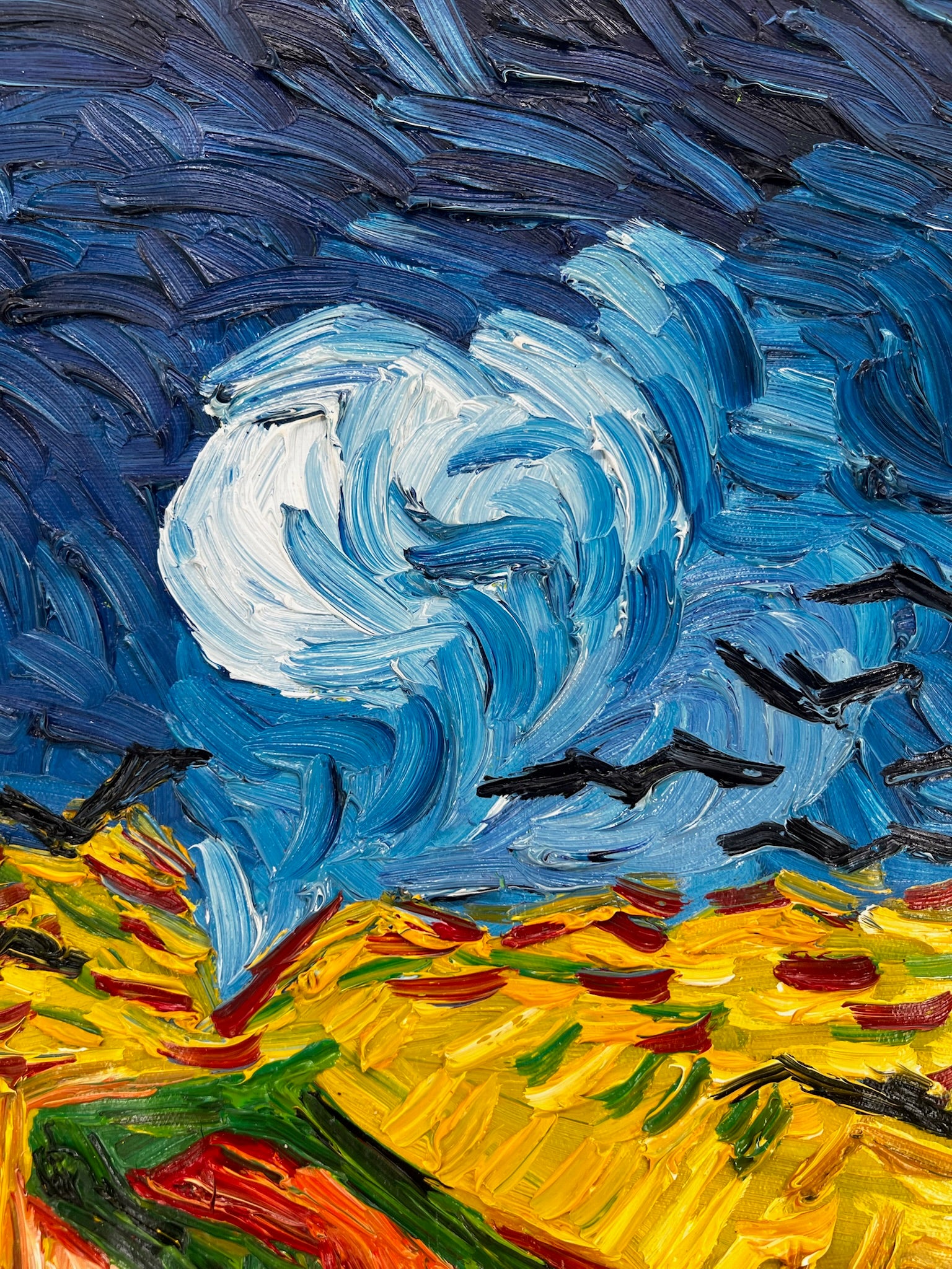El cielo amenazante, el camino vacío y los cuervos en círculo simbolizan inquietud, pero también movimiento y vitalidad. Esta obra de arte única revive el uso expresivo del color y la textura de Van Gogh. Un verdadero punto focal y una poderosa adición a cualquier interior, ideal para amantes del arte y coleccionistas.