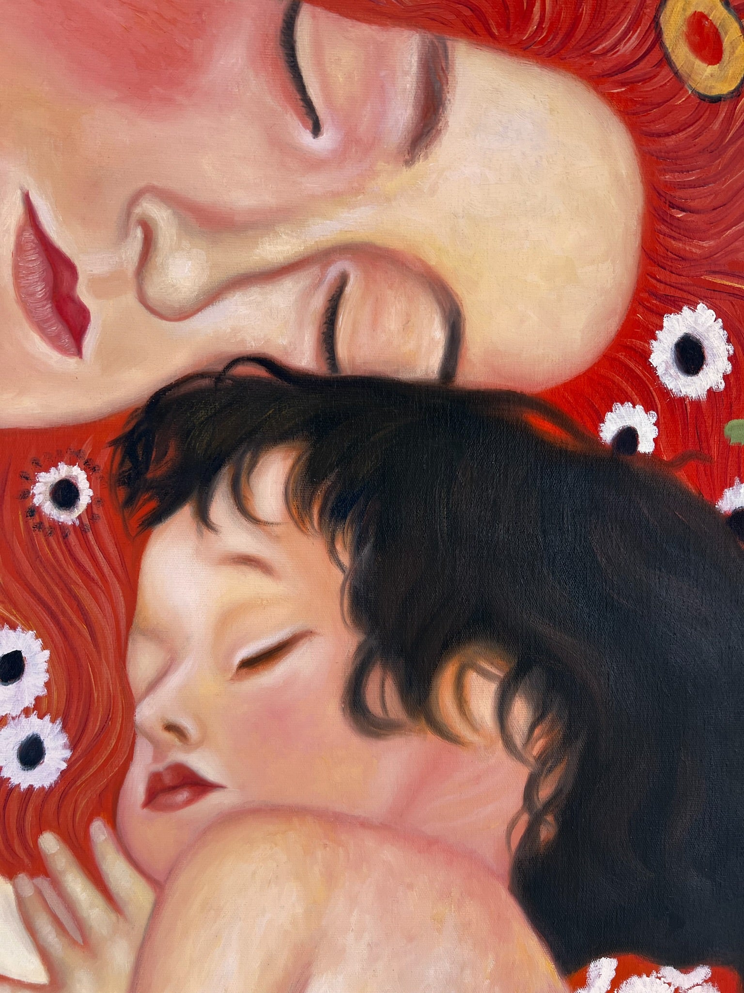 Dit prachtige handgeschilderde werk toont Mutter und Kind, een intiem en teder tafereel van Gustav Klimt. Het beeld maakt deel uit van zijn schilderij Die drei Lebensalter der Frau (1905), waarin Klimt de cyclus van het leven uitbeeldde. Het fragment met moeder en kind is uitgegroeid tot een zelfstandig icoon, dat wereldwijd geliefd is vanwege de warmte, liefde en geborgenheid die het uitstraalt.