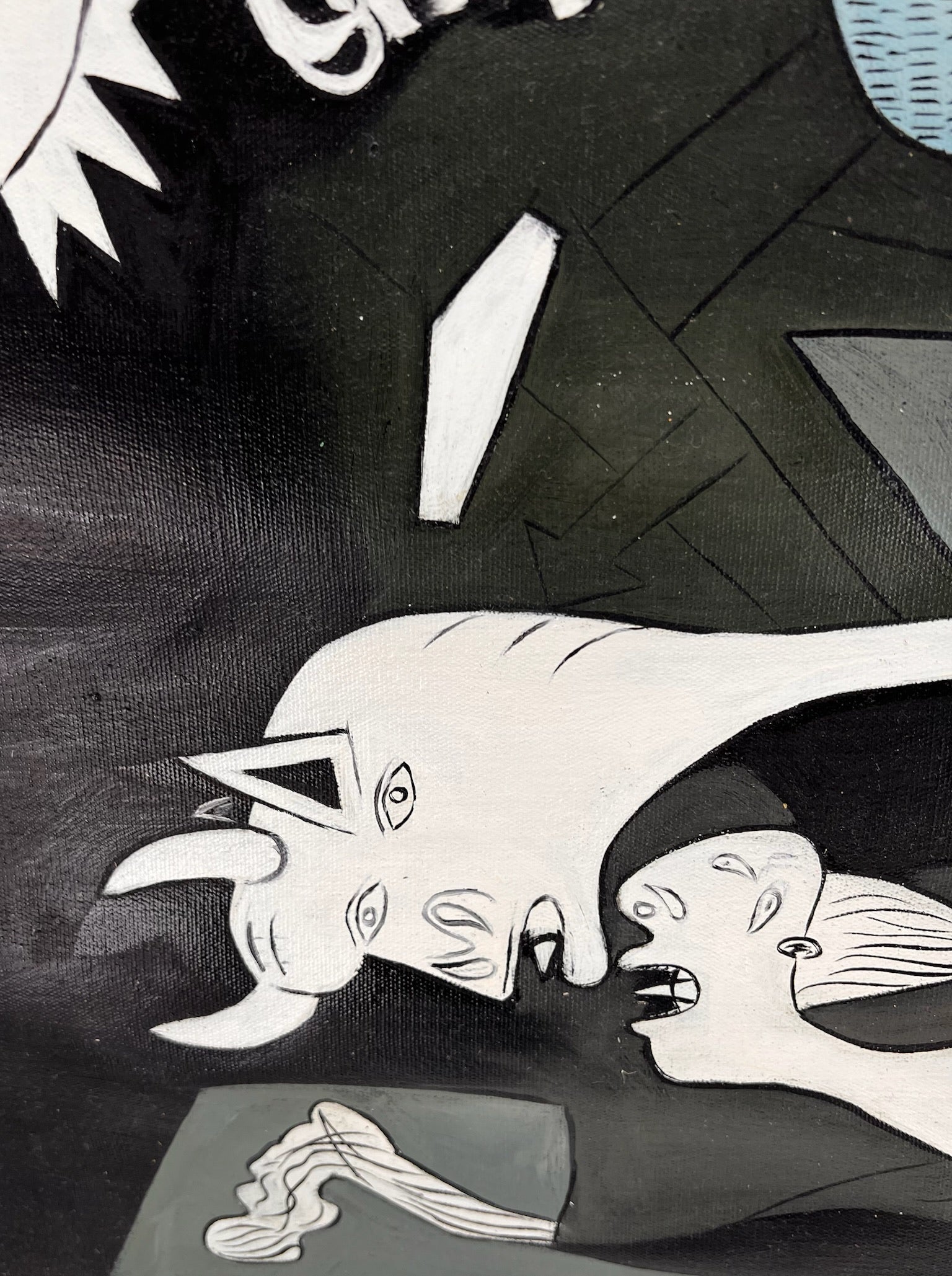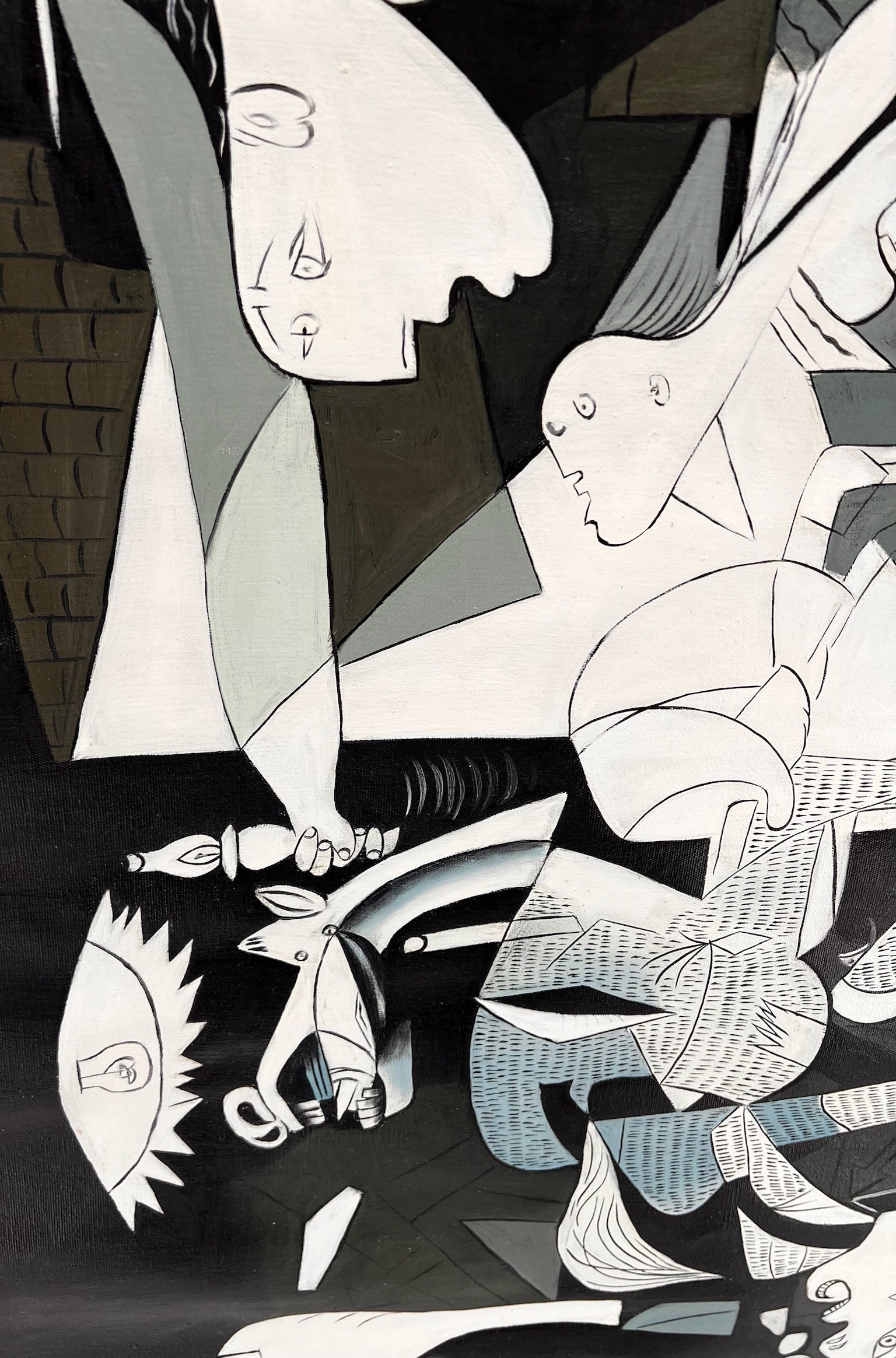 Dit kunstwerk is geïnspireerd op Picasso’s wereldberoemde Guernica (1937), een van de krachtigste aanklachten tegen oorlog in de kunstgeschiedenis. Het schilderij werd gemaakt naar aanleiding van het bombardement op het Baskische dorp Guernica tijdens de Spaanse Burgeroorlog.