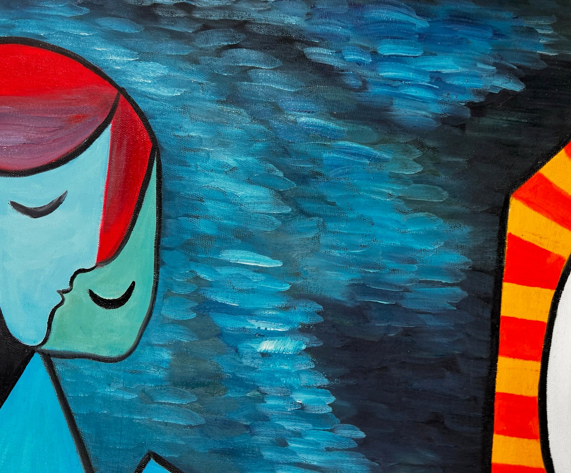 Dit levendige schilderij is geïnspireerd op Pablo Picasso’s werk La Lecture. Het toont een intiem en poëtisch tafereel waarin de geliefde van de kunstenaar verdiept is in het lezen. Met zijn kenmerkende geometrische vormen, uitgesproken lijnen en heldere kleurcontrasten weet Picasso een gevoel van rust en verbondenheid vast te leggen.