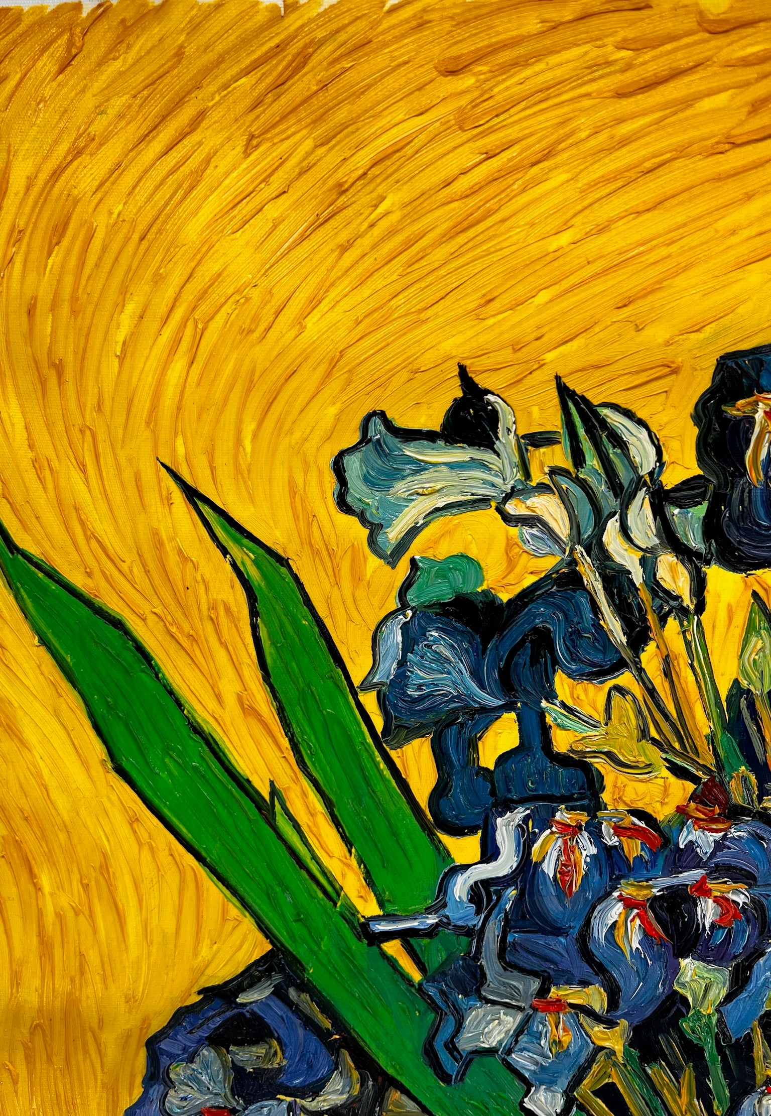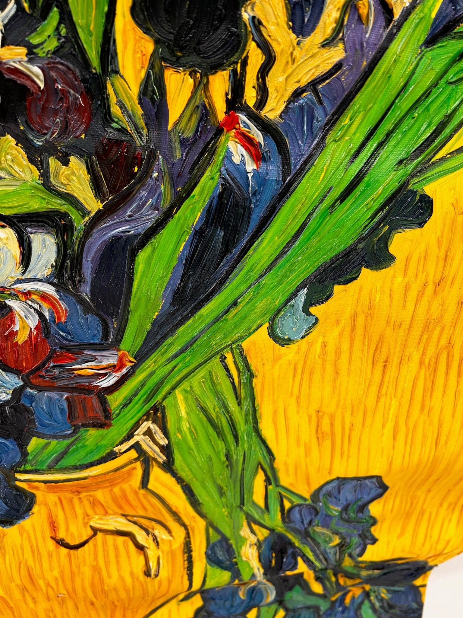 Deze prachtige handgeschilderde interpretatie van Vincent van Gogh’s Vaas met irissen straalt leven en energie uit. Tegen een warme gouden achtergrond komen de diepblauwe en violette irissen tot leven, vol beweging en vitaliteit, en vangen ze Van Gogh’s meesterlijke kleurcontrasten en expressieve penseelstreken.